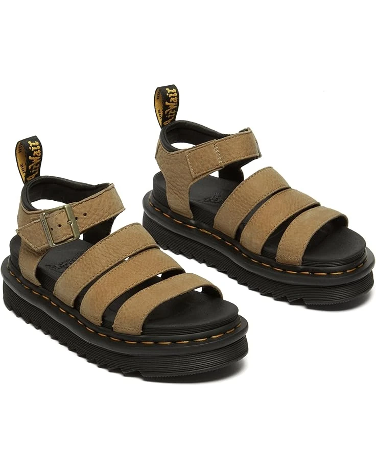 - Indulge in the Dr. Martens® Blaire Sandals that effortlessly combine fashion and function. Designed with a tumbled leather upper and a chic three-strap design, these sandals add a touch of edgy sophistication to any outfit. The sandals are welted with signature yellow stitching and Goodyear® welt construction.