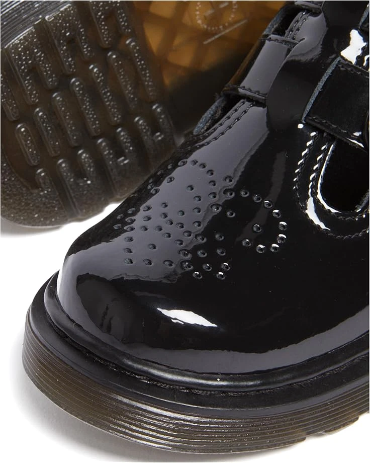 - The versatile Dr. Martens® Kid’s Collection 8065 Mono Junior Mary Jane is retooled in an elegant black-on-black monotone with a brogue across the toe and a high shine leather construction with a classic patent effect. It comes fitted with two adjustable straps secured with hook and loop closure and monochromatic stitching details. The lightweight shoes feature a leather upper, polyester lining, and an ethylene vinyl acetate insole.