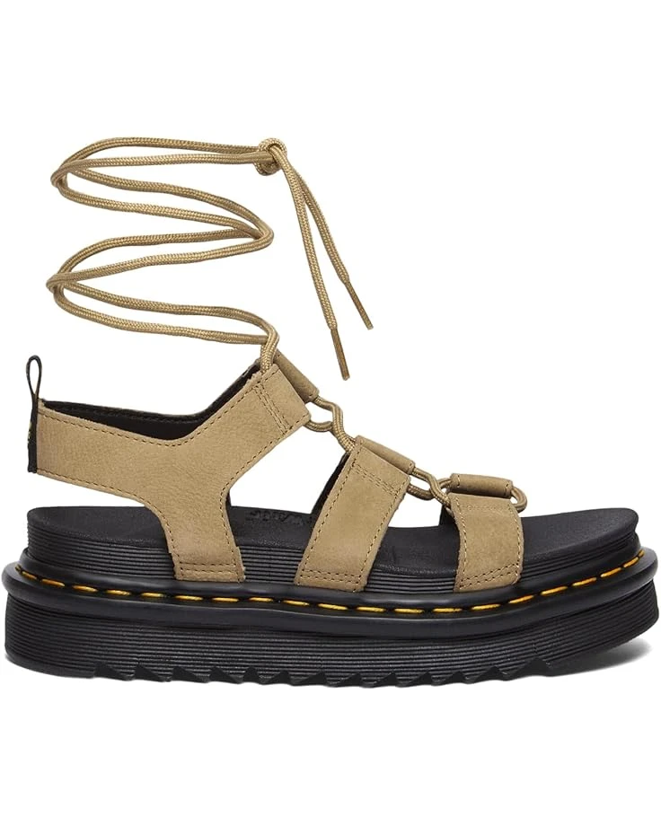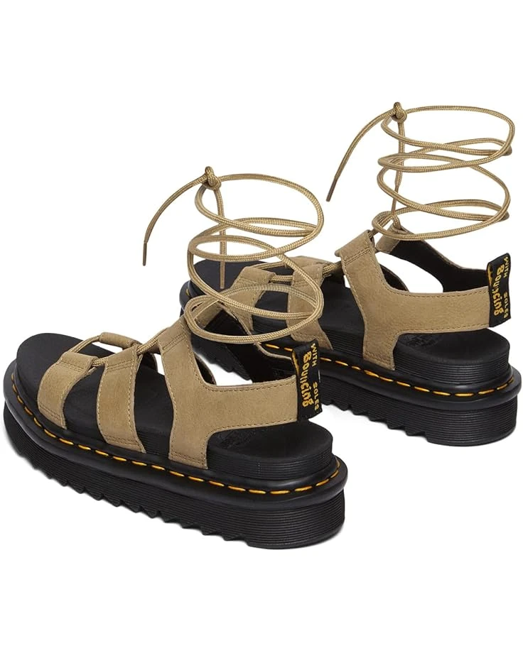- Complete the look with a unique and stylish touch of the Dr. Martens® Nartilla, the ultimate pair of gladiator-style sandals! Made with a tumbled leather upper with an EVA foam footbed, these sandals offer a premium texture and unmatched comfort. The signature scripted heel-loop and yellow stitching add a trendy and sophisticated element.